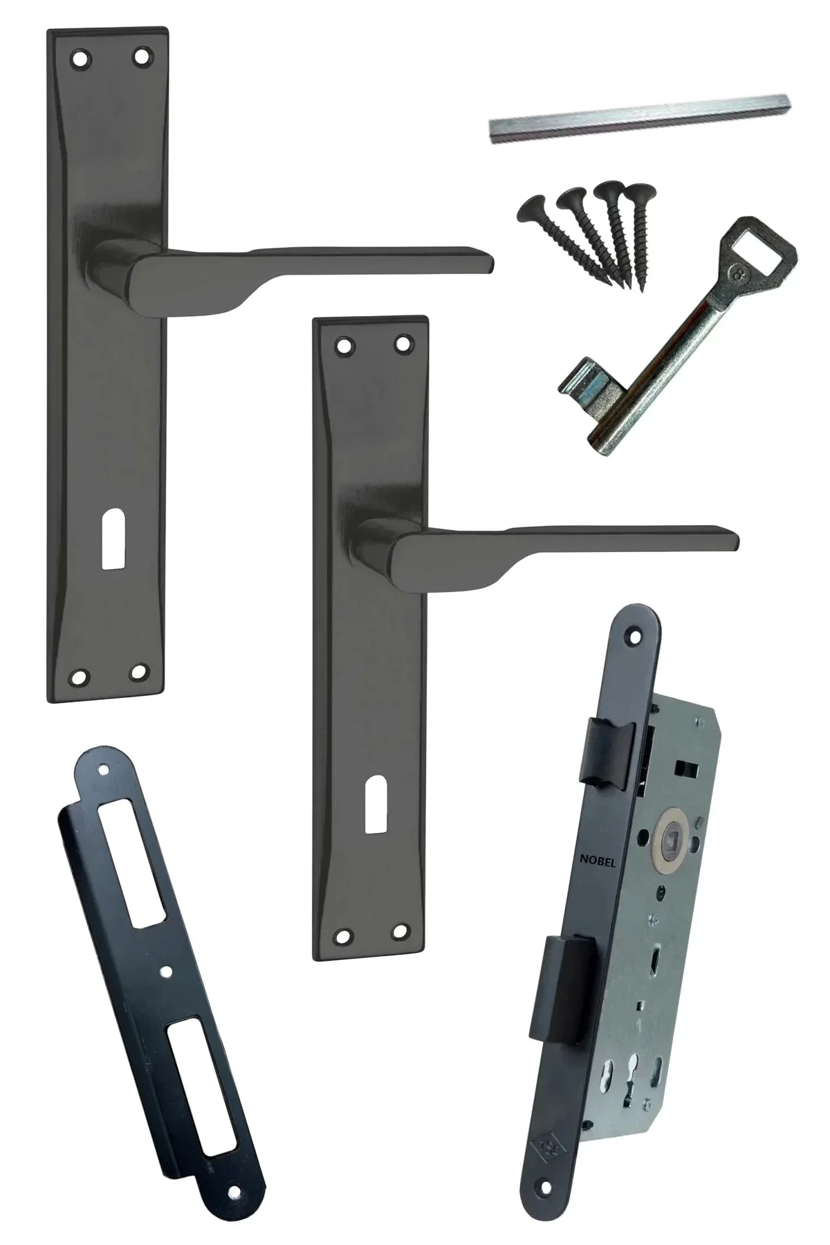 Firuze Siyah Aynalı Kapı Kolu + Siyah Kilit 40mm Oda Takım