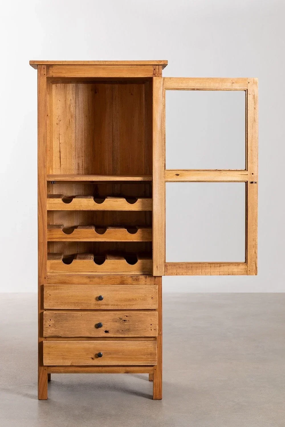 Retro stil ile doğal masif ahşap dokusunu bir araya getiren bu bar dolabı, alanlara estetik bir görünüm kazandırırken işlevsel kullanım sunar.