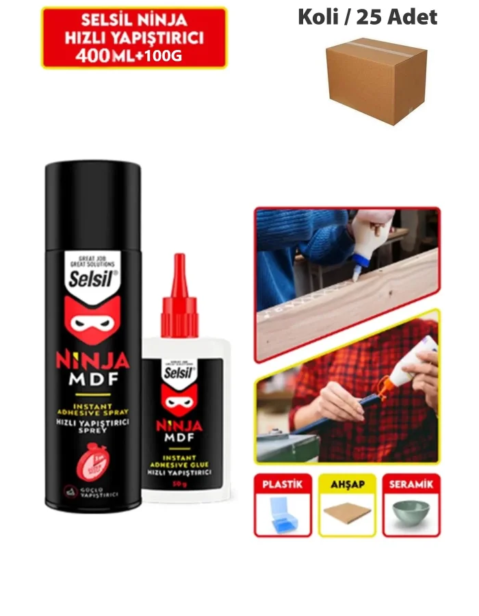 Selsil NİNJA MDF Hızlı Yapıştırıcı, iki komponentli hızlı kürleşen aerosol tipi bir yapıştırıcıdır.